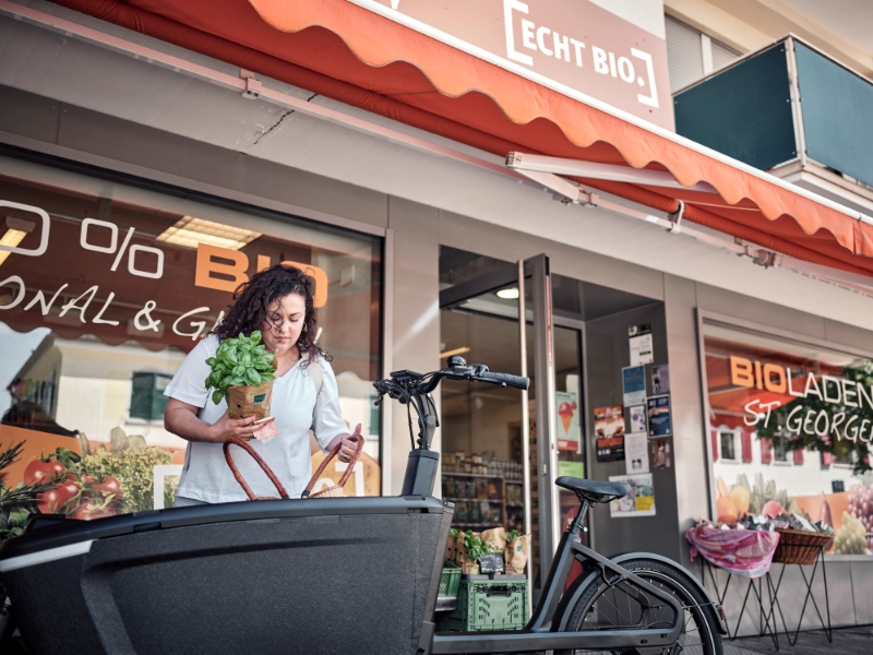 Jobradlerin verstaut ihren Einkauf im Lastenrad